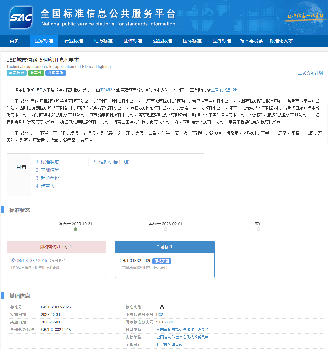 近期,由qy·球友会(中国)电源科技股份有限公司(简称:qy·球友会(中国)电源,股票代码:002660)全资子公司深圳qy·球友会(中国)电子科技有限公司(简称:qy·球友会(中国)电子)参与编制的国家标准《LED城市道路照明应用技术要求》(GB/T31832-2025)正式发布,将于2026年2月1日起实施。该标准由全国建筑节能标准化技术委员会(TC452)归口、中国建筑科研研究院有限公司主编,是对2015年版标准的全面升级,标志着我国LED道路照明行业迎来规范化开展新节点。
